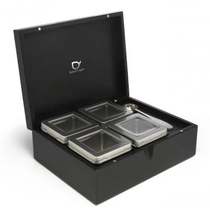 De theedoos van Bredemeijer is gemaakt van zwart bamboe. De kist heeft een compacte afmeting. Het kistje wordt geleverd met vier blikjes en een theemaatlepel voor het bewaren, serveren en presenteren van losse thee.