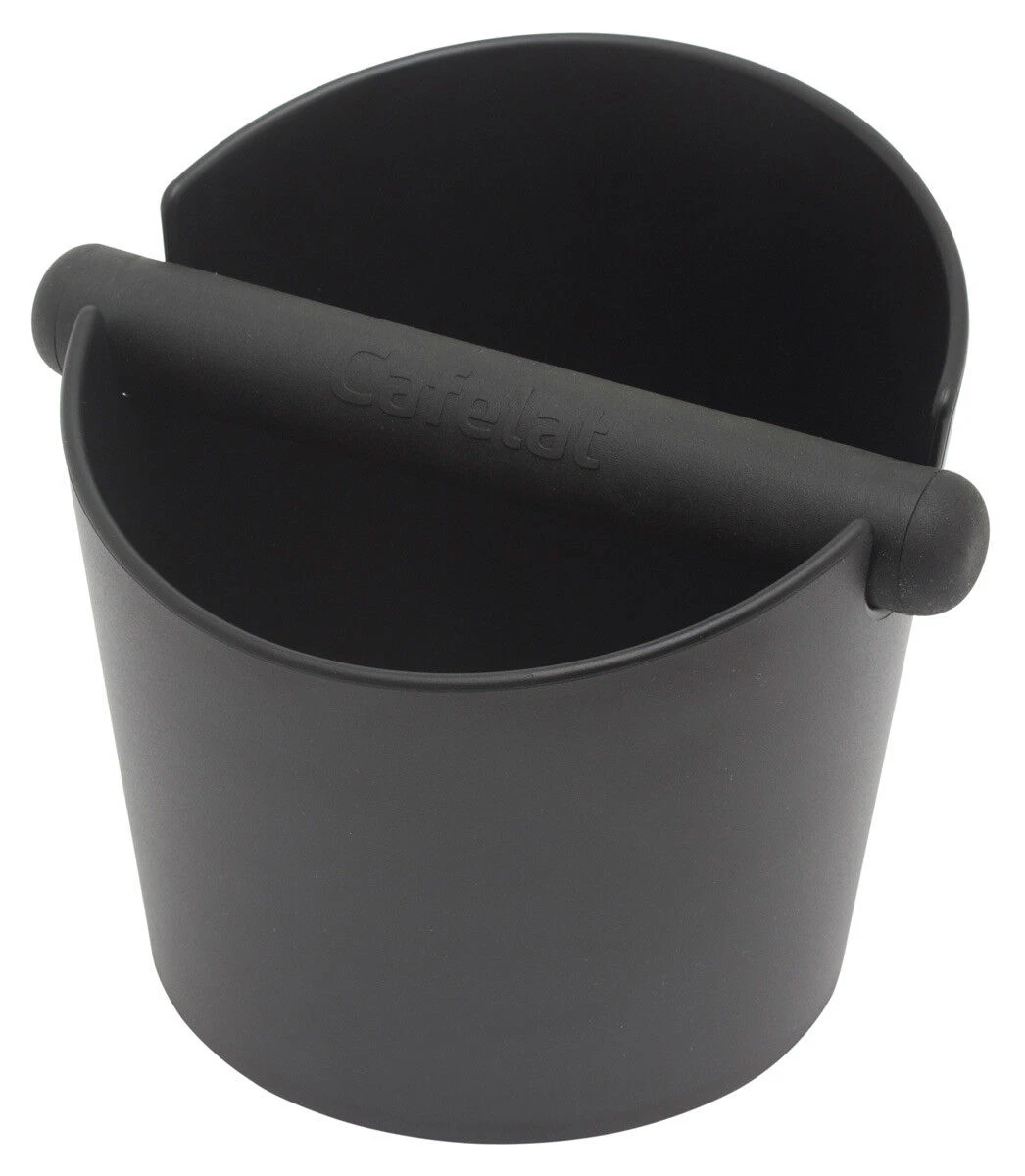 De large Tubbi uitklopbak van Cafelat is gemaakt van zwart kunststof en heeft een hoogte van 15 cm aan de hoge zijde en 11 cm aan de lage zijde. De knockbox heeft een stevige dwarsbalk van met rubber bekleed staal. De bak heeft een diameter van 16,5 cm. Klop uw gebruikte piston leeg in de Tubbi bak.