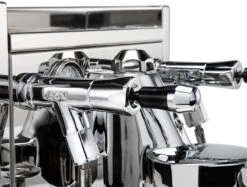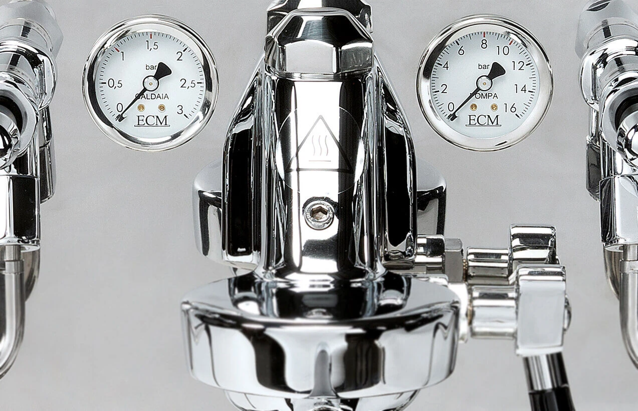 De ECM zetgroep is een doorontwikkeling van de befaamde Faema E61 zetgroep. Deze van verchroomd massief messing gemaakte zetgroep wordt actief verwarmd door de warmtewisselaar voor een goede extractie. Regel eigenhandig de koffiedruk via de praktische stelschroef, voor het optimale resultaat. De doorloop is gereguleerd door een hendel.