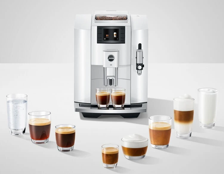 Met de JURA E8 zet u verschillende koffiespecialiteiten, zoals latte macchiato en espresso. De E8 is een zeer compacte volautomatische espressomachine die met 1 druk op de knop cappuccino en 12 andere individueel programmeerbare specialiteiten kan bereiden uit hele of gemalen koffiebonen. De machine wordt heel eenvoudig aangestuurd vanaf het grote 2,8″ kleurendisplay aan de voorzijde.