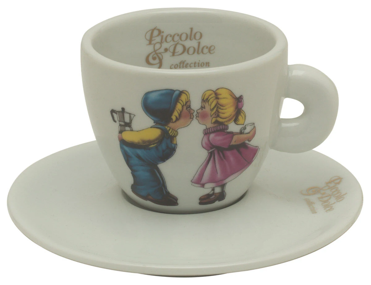 De Lucaffé Piccolo & Dolce cappuccinokop en schotel zijn vervaardigd uit wit aardewerk. Het kopje is voorzien van de ‘Piccolo & Dolce’ print. Gebruik de kop en schotel voor het serveren van cappuccino of gewone koffie.